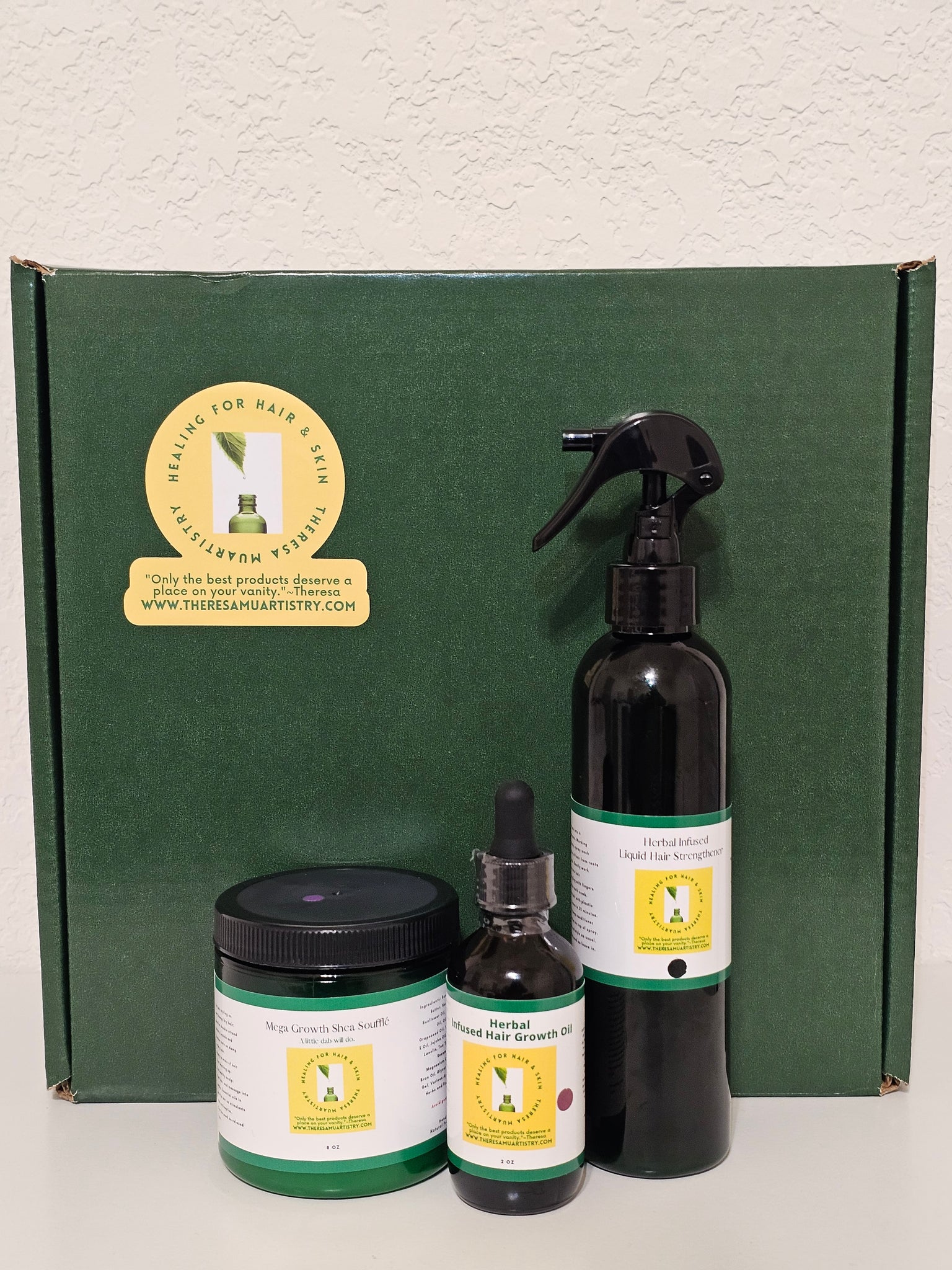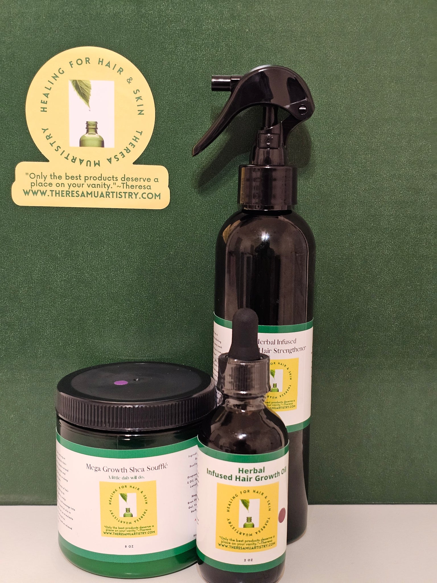 Combo Pack 8 Oz Ayurvedic Liquid Strengthener, 8 Oz Mega Growth Shea Soufflé & 2 Oz Ayurvedic Herbs Infused Hair Growth Oil