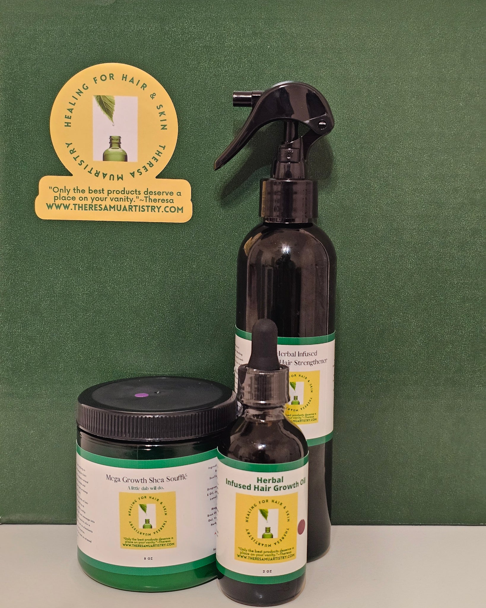 The Herbal Infused Hair Growth Oil is healing edges, alopecia, post partum shedding and post pandemic hair damage across the nation. Made of moisturizing carrier oils, scalp stimulating anti-inflammatory essential oils and infused in the dark with over 7 Ayurvedic Herbs over a 3 month period this oil is delivered in a velvet pouch like the gem it is.